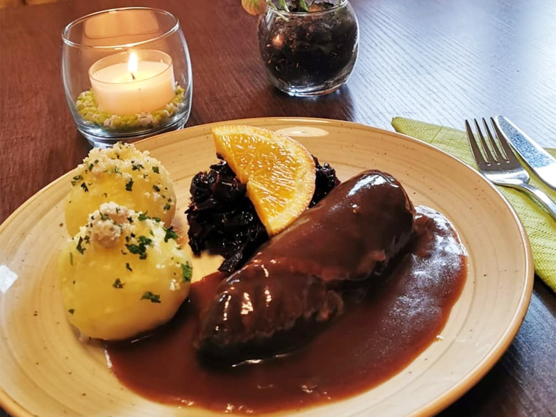 Sächsische Rinderroulade mit Apfel-Rotkraut und Klößen/Kartoffeln